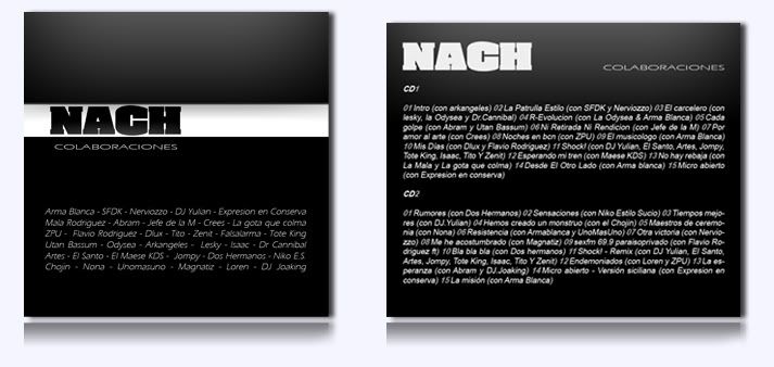 El disco de hoy es una doble entrega, se trata de una recopilación de colabos de este gran MC de ALI; 30 tracks en total de excelentes colaboraciones de NACH, a mi gusto el mejor de los mcs españoles. "El hombre poema" en este colabos yrabaja junto a la mayoría sino a todos los mcs mas importantes de la escena actual española, ZPU, SFDK, Arma Blanca, Falsalarma, Tote King, entre otros. verdaderamente un imperdible compilado del hip hop español. ENJOY!